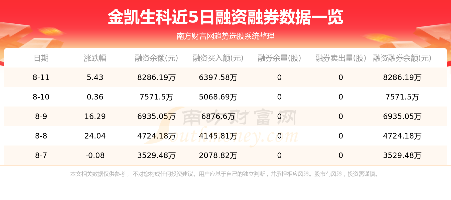 金凯生科8月11日融券信息显示,融资方面,当日融资买入6397.58万元,融资偿还5682.88万元,融资净买额714.7万元。近5日融资融券数据一览见下表: