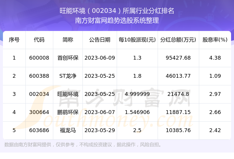 二、旺能环境002034行业分红排名