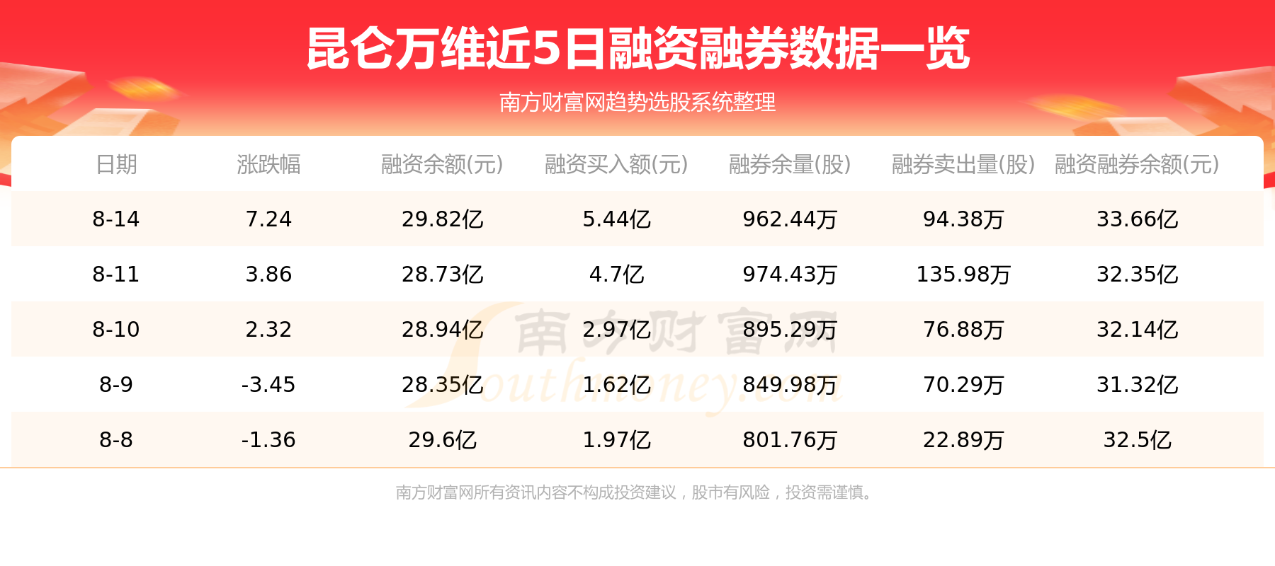 昆仑万维8月14日融券信息显示,融资方面,当日融资买入5.44亿元,融资偿还4.35亿元,融资净买额1.09亿元。融券方面,融券卖出94.38万股,融券偿还106.36万股,融券余量962.44万股,融券余额3.84亿元。融资融券余额33.66亿元。近5日融资融券数据一览见下表: