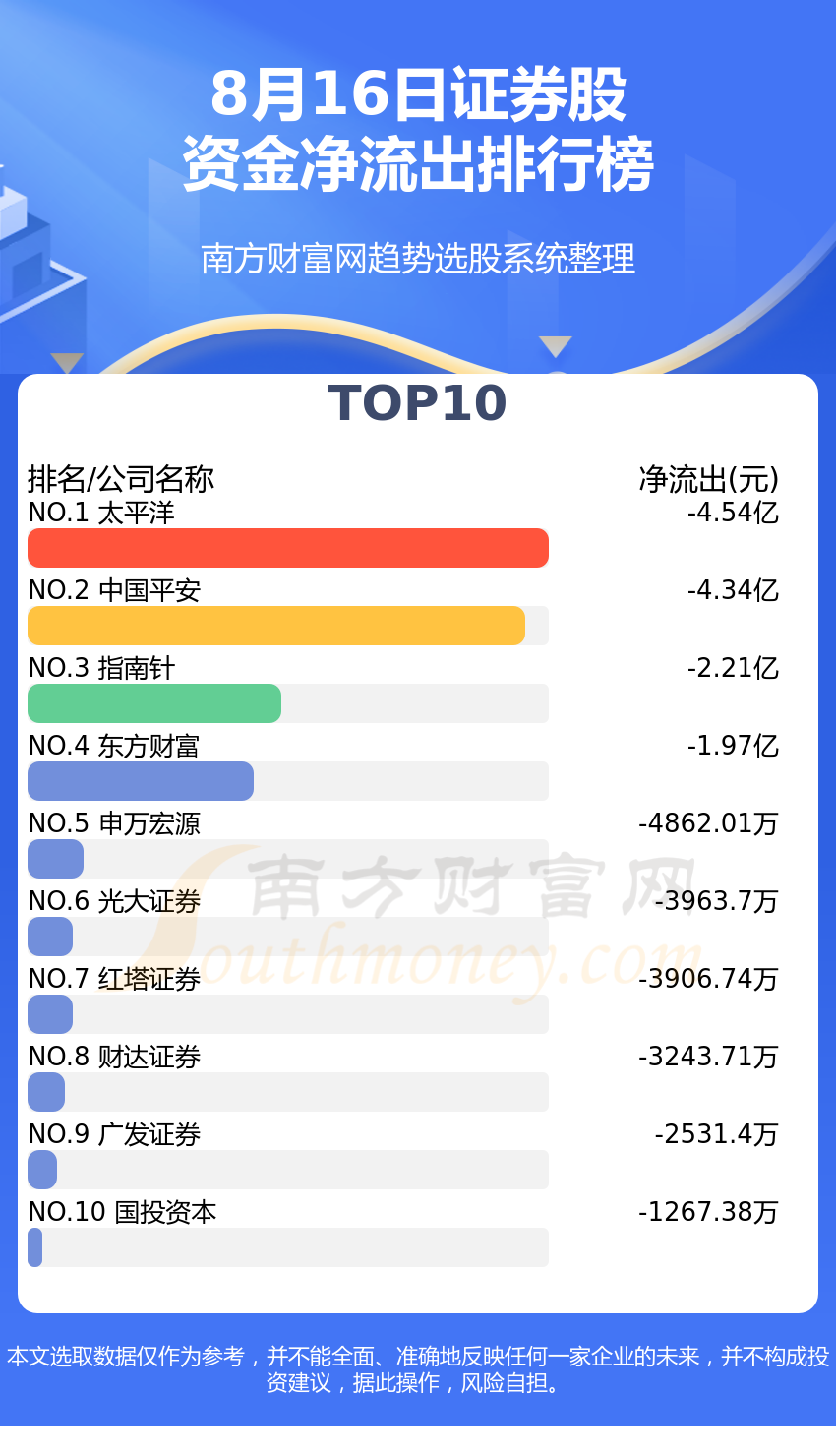 证券行业8月16日资金净流出情况来看,太平洋位列第一位,主力净流出达到-4.54亿元;中国平安排名第二,主力净流出为-4.34亿元;指南针排名第三,主力净流出-2.21亿元。主力净流出排名前10的还有:东方财富、申万宏源、光大证券、红塔证券、财达证券、广发证券、国投资本。