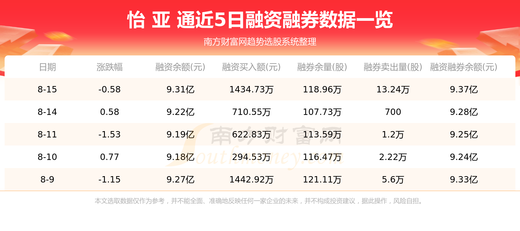 怡 亚 通8月15日融券信息显示,融资方面,当日融资买入1434.73万元,融资偿还528.34万元,融资净买额906.39万元。融券方面,融券卖出13.24万股,融券偿还2.01万股,融券余量118.96万股,融券余额611.46万元。融资融券余额9.37亿元。