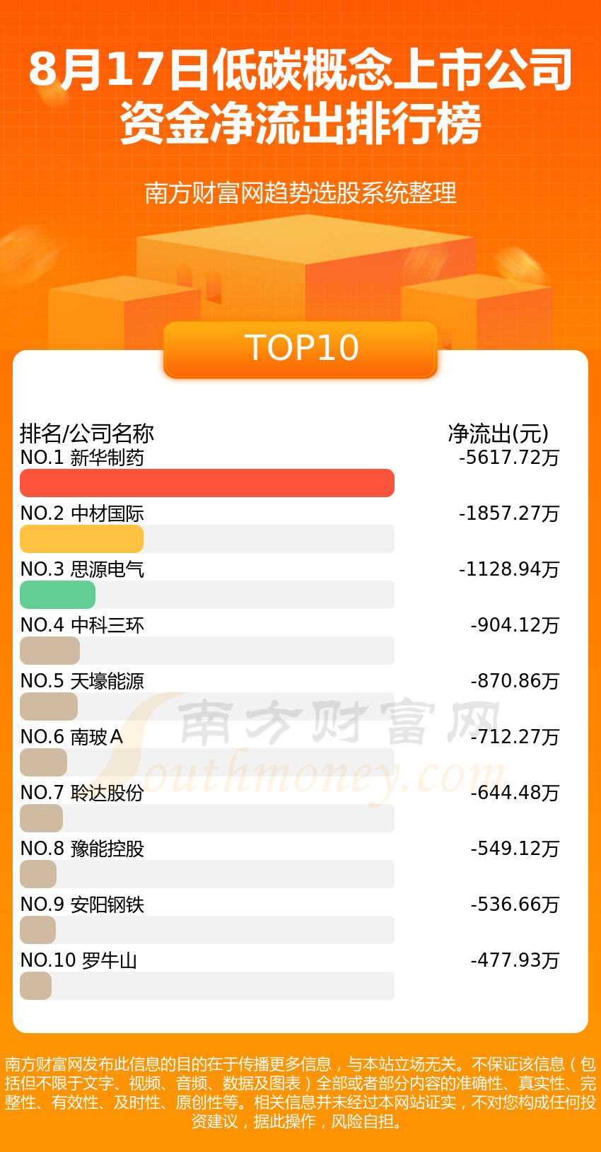低碳概念上市公司8月17日资金净流出情况来看,新华制药位列第一位,主力净流出达到-5617.72万元;中材国际排名第二,主力净流出为-1857.27万元;思源电气排名第三,主力净流出-1128.94万元。主力净流出排名前10的还有:中科三环、天壕能源、南玻A、聆达股份、豫能控股、安阳钢铁、罗牛山。