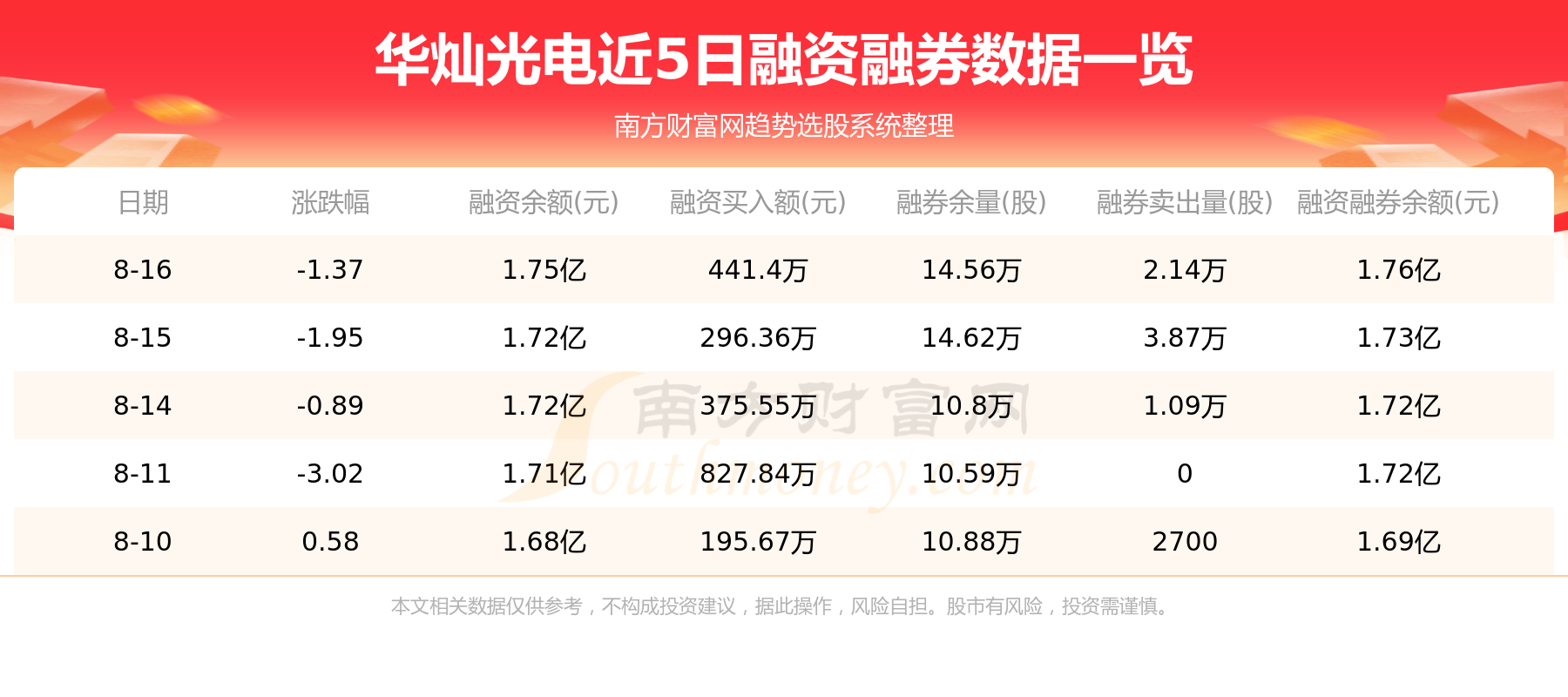 8月16日华灿光电融券信息显示,融资方面,当日融资买入441.4万元,融资偿还131.3万元,融资净买额310.1万元。融券方面,融券卖出2.14万股,融券偿还2.2万股,融券余量14.56万股,融券余额94.09万元。融资融券余额1.76亿元。近5日融资融券数据一览见下表: