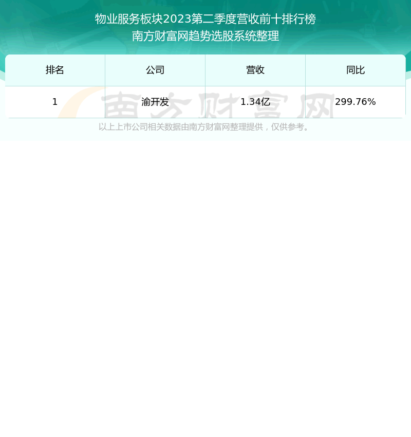 按照趋势选股系统统计,该股所属板块为物业服务板块,该板块共有1只股票,迪马股份2023第二季度营收在该板块中排名为第1名,该板块2023第二季度营收排名前十的股票如下表: