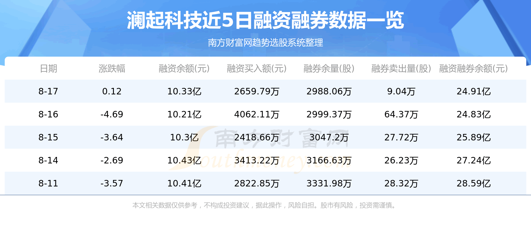 8月17日澜起科技融券信息显示,融资方面,当日融资买入2659.79万元,融资偿还1466.07万元,融资净买额1193.72万元。融券方面,融券卖出9.04万股,融券偿还20.35万股,融券余量2988.06万股,融券余额14.58亿元。融资融券余额24.91亿元。近5日融资融券数据一览见下表: