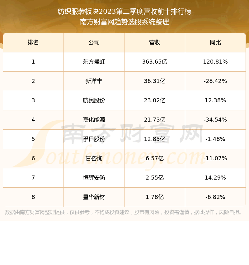 按照趋势选股系统统计,该股所属板块为纺织服装板块,该板块共有8只股票,际华集团2023第二季度营收在该板块中排名为第8名,该板块2023第二季度营收排名前十的股票如下表: