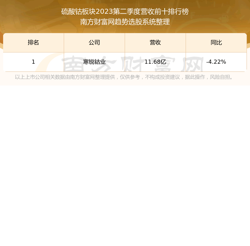 按照趋势选股系统统计,该股所属板块为硫酸钴板块,该板块共有1只股票,芳源股份2023第二季度营收在该板块中排名为第1名,该板块2023第二季度营收排名前十的股票如下表: