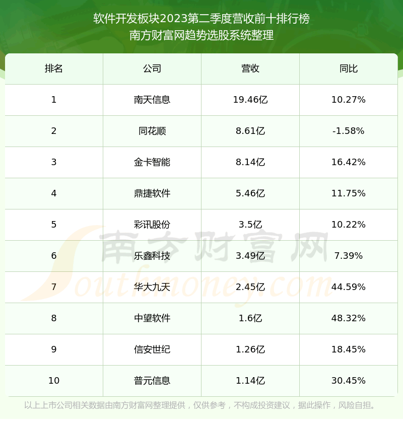按照趋势选股系统统计,该股所属板块为软件开发板块,该板块共有11只股票,新致软件2023第二季度营收在该板块中排名为第11名,该板块2023第二季度营收排名前十的股票如下表: