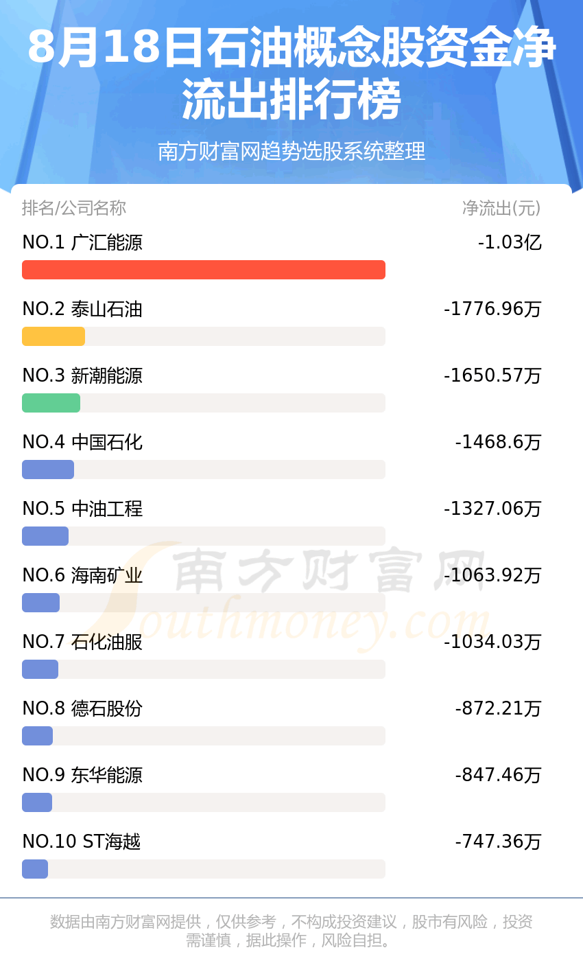 石油概念股8月18日资金净流出情况来看,广汇能源位列第一位,主力净流出达到-1.03亿元;泰山石油排名第二,主力净流出为-1776.96万元;新潮能源排名第三,主力净流出-1650.57万元。主力净流出排名前10的还有:中国石化、中油工程、海南矿业、石化油服、德石股份、东华能源、ST海越。