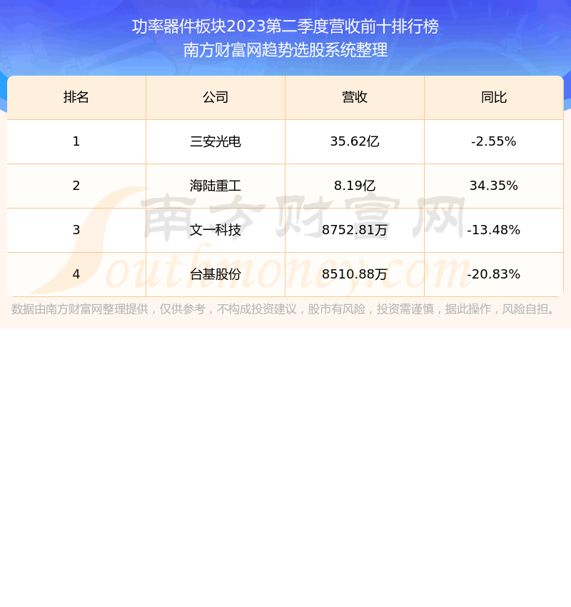 按照趋势选股系统统计,该股所属板块为功率器件板块,该板块共有4只股票,芯导科技2023第二季度营收在该板块中排名为第4名,该板块2023第二季度营收排名前十的股票如下表: