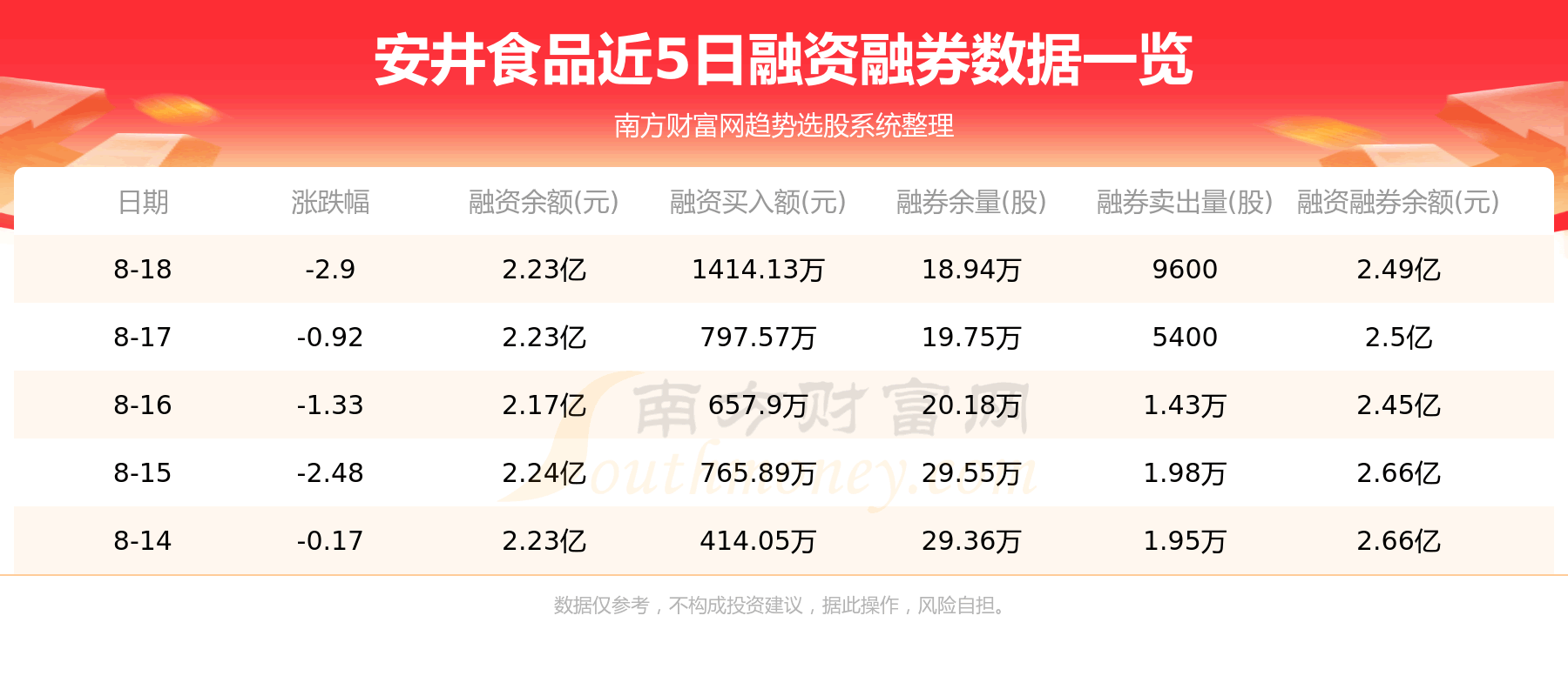 8月18日安井食品融券信息显示,融资方面,当日融资买入1414.13万元,融资偿还1322.61万元,融资净买额91.52万元。融券方面,融券卖出9600股,融券偿还1.77万股,融券余量18.94万股,融券余额2578.78万元。融资融券余额2.49亿元。近5日融资融券数据一览见下表: