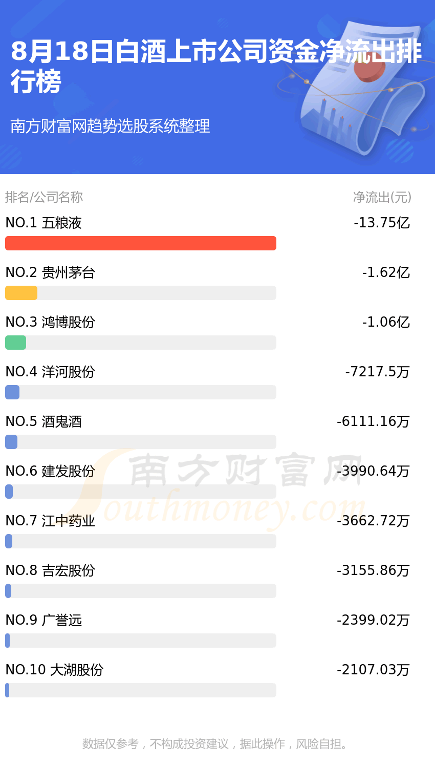白酒上市公司8月18日资金净流出情况来看,五粮液位列第一位,主力净流出达到-13.75亿元;贵州茅台排名第二,主力净流出为-1.62亿元;鸿博股份排名第三,主力净流出-1.06亿元。主力净流出排名前10的还有:洋河股份、酒鬼酒、建发股份、江中药业、吉宏股份、广誉远、大湖股份。