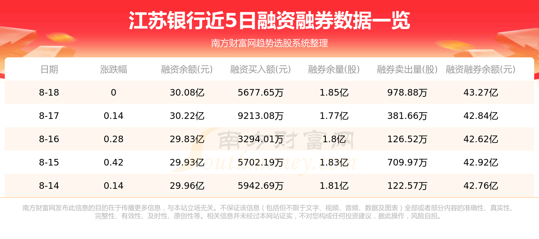 8月18日江苏银行融券信息显示,融资方面,当日融资买入5677.65万元,融资偿还7152.75万元,融资净买额-1475.1万元。融券方面,融券卖出978.88万股,融券偿还169.29万股,融券余量1.85亿股,融券余额13.2亿元。融资融券余额43.27亿元。近5日融资融券数据一览见下表: