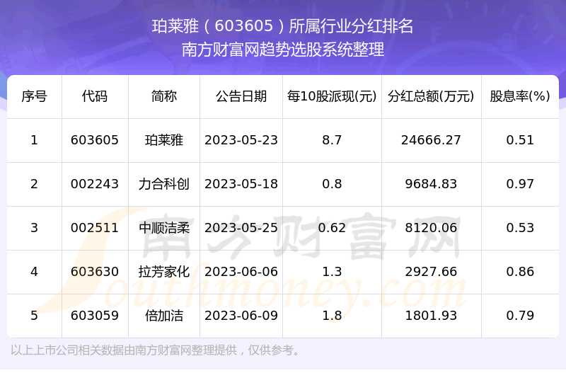 按照趋势选股系统统计,珀莱雅所属行业为美容护理行业,美容护理行业分红排名情况如下表: