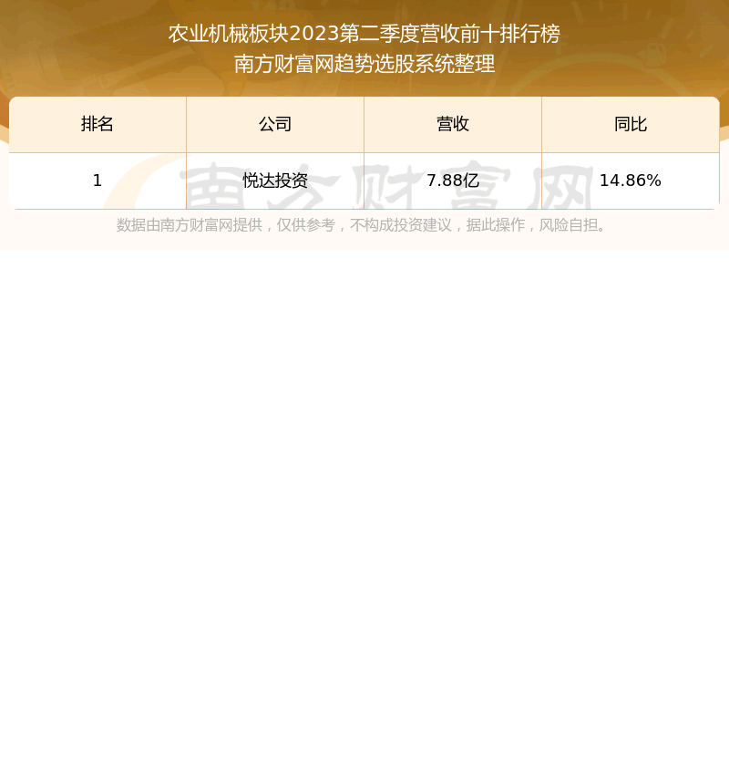 按照趋势选股系统统计,该股所属板块为农业机械板块,该板块共有1只股票,林海股份2023第二季度营收在该板块中排名为第1名,该板块2023第二季度营收排名前十的股票如下表: