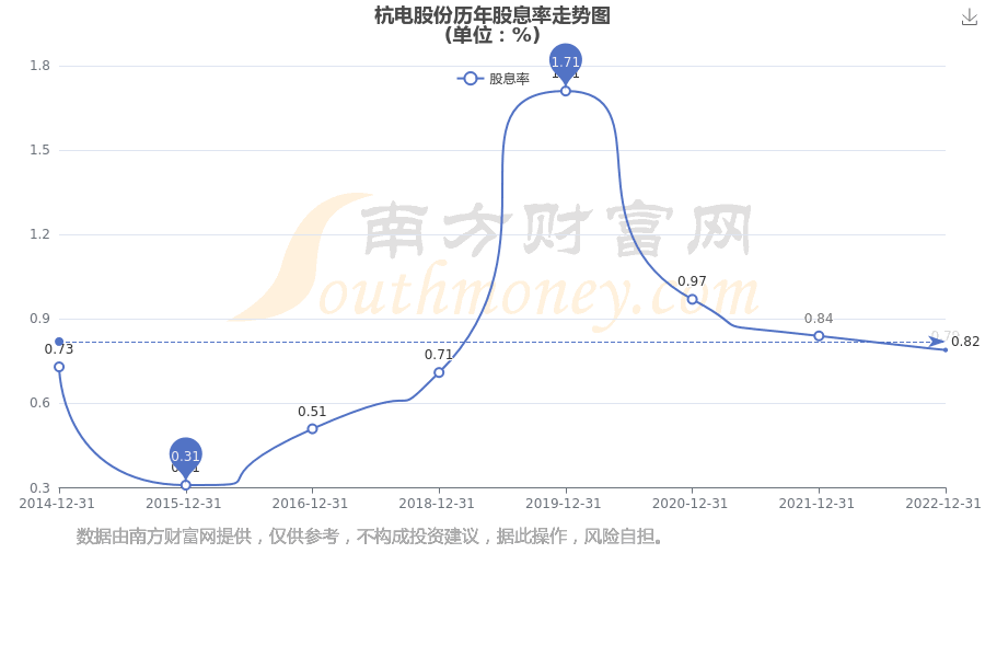 杭电股份最新一次公布的分红方案为10派0.5元。本次权益分派股权登记日为2023年6月6日,除权除息日为2023年6月7日,派息日为2023年6月7日。