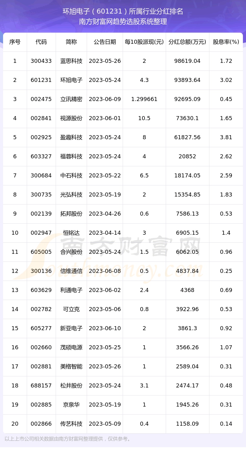 按照趋势选股系统统计,环旭电子所属行业为通讯产品行业,通讯产品行业分红排名情况如下表: