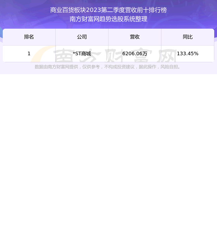 按照趋势选股系统统计,该股所属板块为商业百货板块,该板块共有1只股票,国芳集团2023第二季度营收在该板块中排名为第1名,该板块2023第二季度营收排名前十的股票如下表: