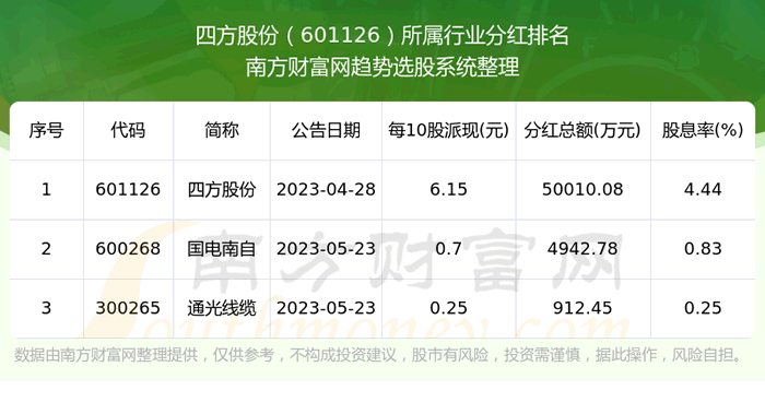 按照趋势选股系统统计,四方股份所属行业为新能源行业,新能源行业分红排名情况如下表:
