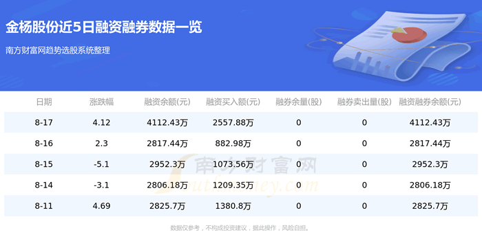 金杨股份8月17日融券信息显示,融资方面,当日融资买入2557.88万元,融资偿还1262.89万元,融资净买额1294.99万元。