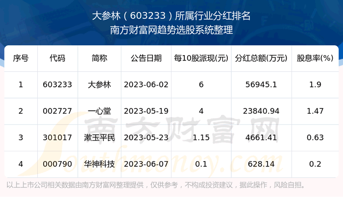 按照趋势选股系统统计,大参林所属行业为中西成药行业,中西成药行业分红排名情况如下表: