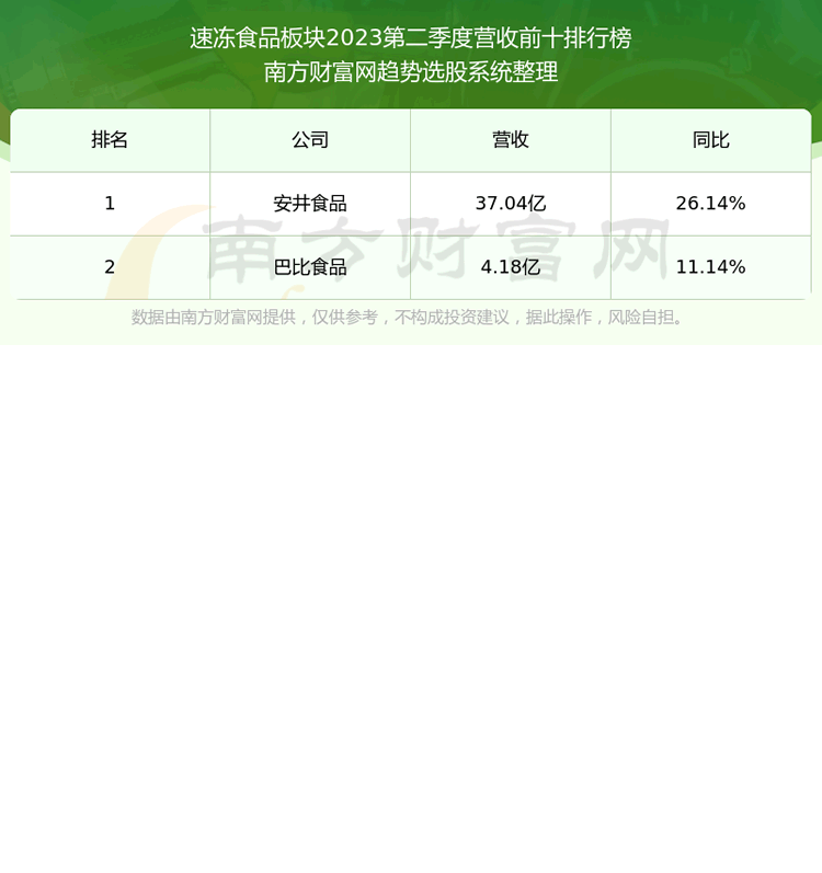 按照趋势选股系统统计,该股所属板块为速冻食品板块,该板块共有2只股票,安井食品2023第二季度营收在该板块中排名为第1名,该板块2023第二季度营收排名前十的股票如下表: