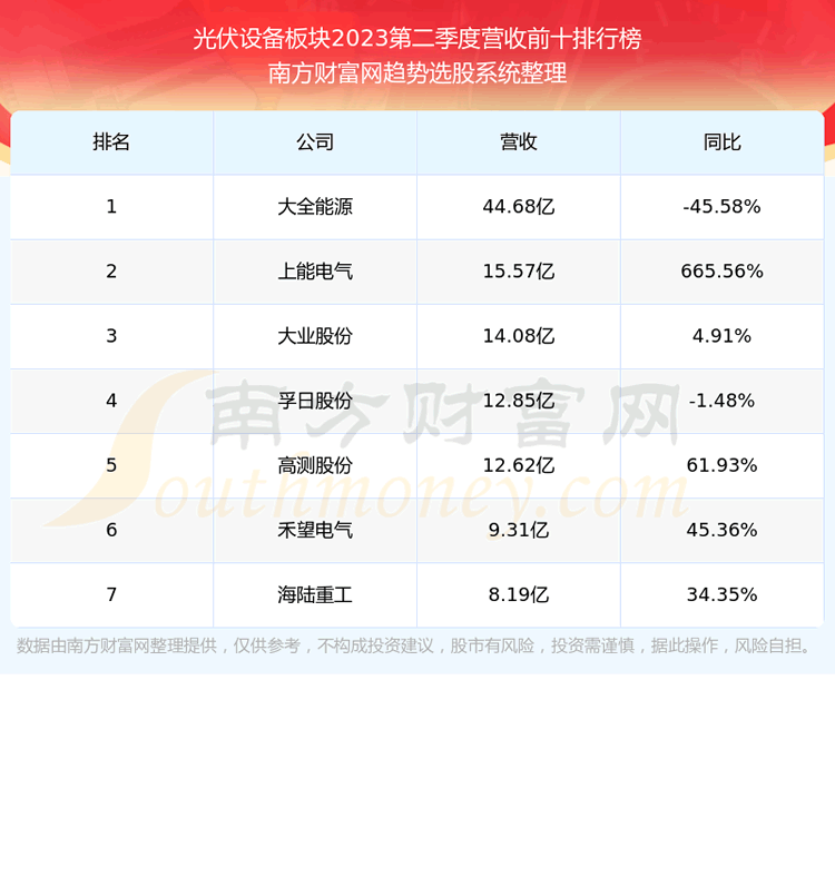 按照趋势选股系统统计,该股所属板块为光伏设备板块,该板块共有7只股票,金博股份2023第二季度营收在该板块中排名为第7名,该板块2023第二季度营收排名前十的股票如下表: