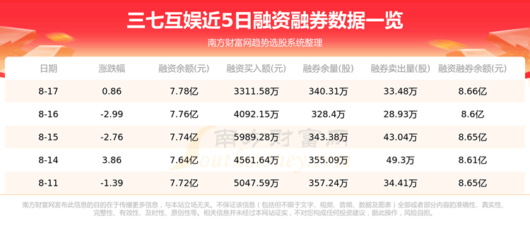 三七互娱8月17日融券信息显示,融资方面,当日融资买入3311.58万元,融资偿还3103.52万元,融资净买额208.06万元。融券方面,融券卖出33.48万股,融券偿还21.57万股,融券余量340.31万股,融券余额8807.19万元。融资融券余额8.66亿元。近5日融资融券数据一览见下表:
