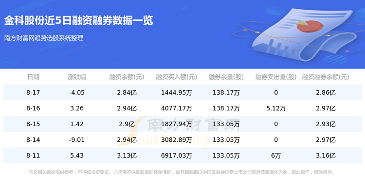 8月17日金科股份融券信息显示,融资方面,当日融资买入1444.95万元,融资偿还2494.29万元,融资净买额-1049.34万元。近5日融资融券数据一览见下表:
