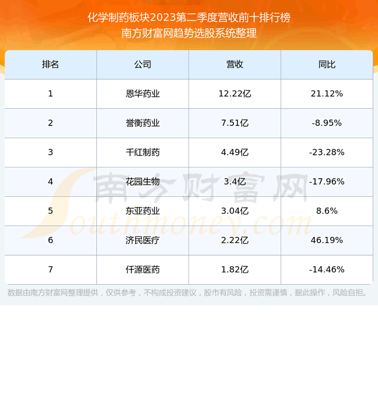 按照趋势选股系统统计,该股所属板块为化学制药板块,该板块共有7只股票,鲁抗医药2023第二季度营收在该板块中排名为第7名,该板块2023第二季度营收排名前十的股票如下表: