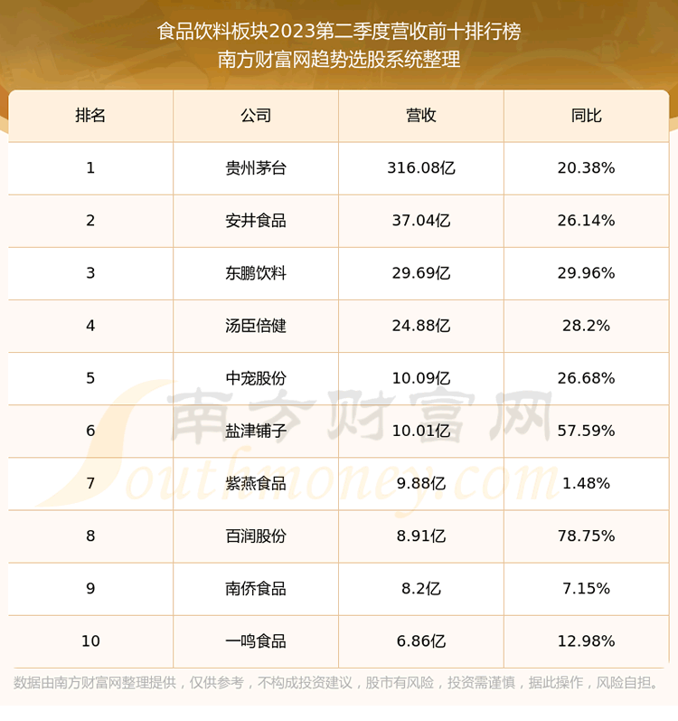 按照趋势选股系统统计,该股所属板块为食品饮料板块,该板块共有18只股票,千禾味业2023第二季度营收在该板块中排名为第18名,该板块2023第二季度营收排名前十的股票如下表:
