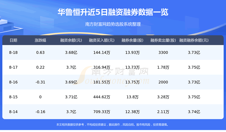 华鲁恒升8月18日融券信息显示,融资方面,当日融资买入144.14万元,融资偿还346.54万元,融资净买额-202.4万元。融券方面,融券卖出3300股,融券偿还1300股,融券余量13.93万股,融券余额448万元。融资融券余额3.73亿元。近5日融资融券数据一览见下表: