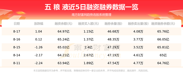五 粮 液8月17日融券信息显示,融资方面,当日融资买入1.15亿元,融资偿还1.42亿元,融资净买额-2699.85万元。融券方面,融券卖出4.08万股,融券偿还5.75万股,融券余量46.68万股,融券余额7862.75万元。融资融券余额65.76亿元。近5日融资融券数据一览见下表:
