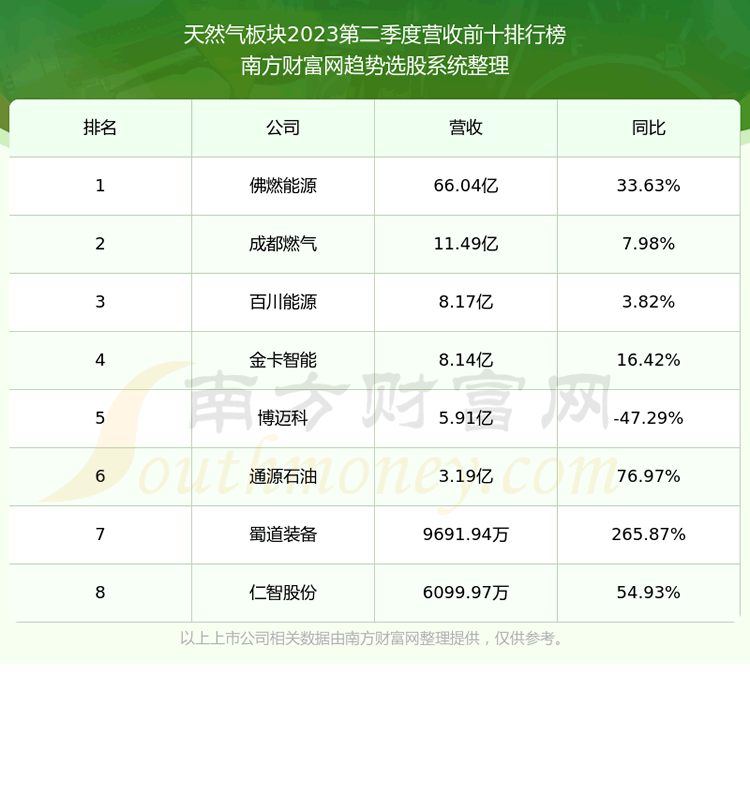 按照趋势选股系统统计,该股所属板块为天然气板块,该板块共有8只股票,广汇能源2023第二季度营收在该板块中排名为第8名,该板块2023第二季度营收排名前十的股票如下表: