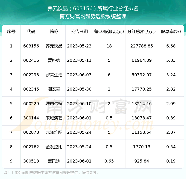 按照趋势选股系统统计,养元饮品所属行业为食品饮料行业,食品饮料行业分红排名情况如下表: