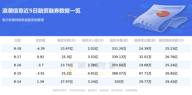 8月18日浪潮信息融券信息显示,融资方面,当日融资买入2.02亿元,融资偿还3.46亿元,融资净买额-1.43亿元。融券方面,融券卖出24.39万股,融券偿还32.25万股,融券余量331.26万股,融券余额1.36亿元。融资融券余额25.23亿元。近5日融资融券数据一览见下表:
