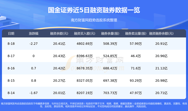 8月18日国金证券融券信息显示,融资方面,当日融资买入4802.69万元,融资偿还4972.13万元,融资净买额-169.44万元。融券方面,融券卖出57.99万股,融券偿还74.45万股,融券余量508.39万股,融券余额5033.09万元。融资融券余额20.91亿元。近5日融资融券数据一览见下表: