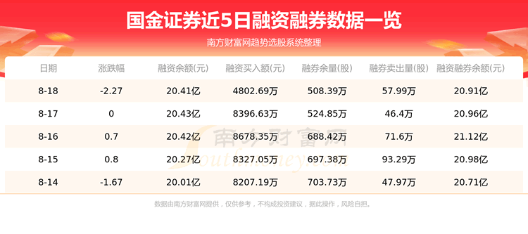 8月18日国金证券融券信息显示,融资方面,当日融资买入4802.69万元,融资偿还4972.13万元,融资净买额-169.44万元。融券方面,融券卖出57.99万股,融券偿还74.45万股,融券余量508.39万股,融券余额5033.09万元。融资融券余额20.91亿元。近5日融资融券数据一览见下表: