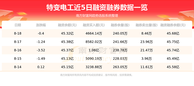 特变电工8月18日融券信息显示,融资方面,当日融资买入4664.14万元,融资偿还5300.56万元,融资净买额-636.41万元。融券方面,融券卖出8.46万股,融券偿还10.07万股,融券余量240.05万股,融券余额3622.3万元。融资融券余额45.68亿元。近5日融资融券数据一览见下表: