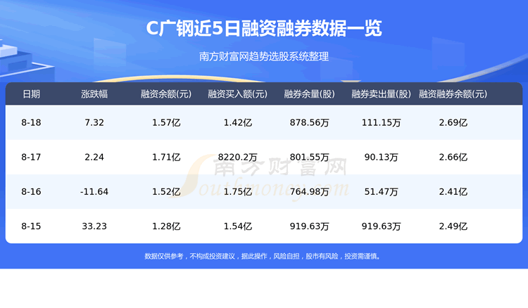 8月18日C广钢融券信息显示,融资方面,当日融资买入1.42亿元,融资偿还1.56亿元,融资净买额-1427.17万元。融券方面,融券卖出111.15万股,融券偿还34.14万股,融券余量878.56万股,融券余额1.12亿元。融资融券余额2.69亿元。近5日融资融券数据一览见下表: