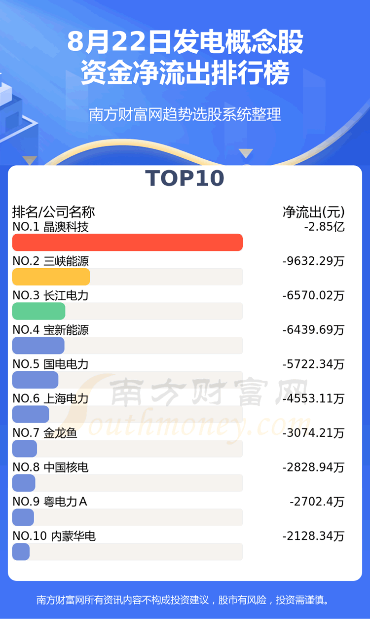 发电概念股8月22日资金净流出情况来看,晶澳科技位列第一位,主力净流出达到-2.85亿元;三峡能源排名第二,主力净流出为-9632.29万元;长江电力排名第三,主力净流出-6570.02万元。主力净流出排名前10的还有:宝新能源、国电电力、上海电力、金龙鱼、中国核电、粤电力A、内蒙华电。
