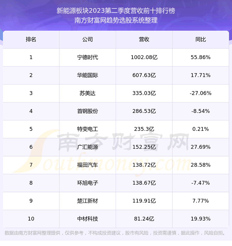 按照趋势选股系统统计,该股所属板块为新能源板块,该板块共有152只股票,上海电气2023第二季度营收在该板块中排名为第152名,该板块2023第二季度营收排名前十的股票如下表:
