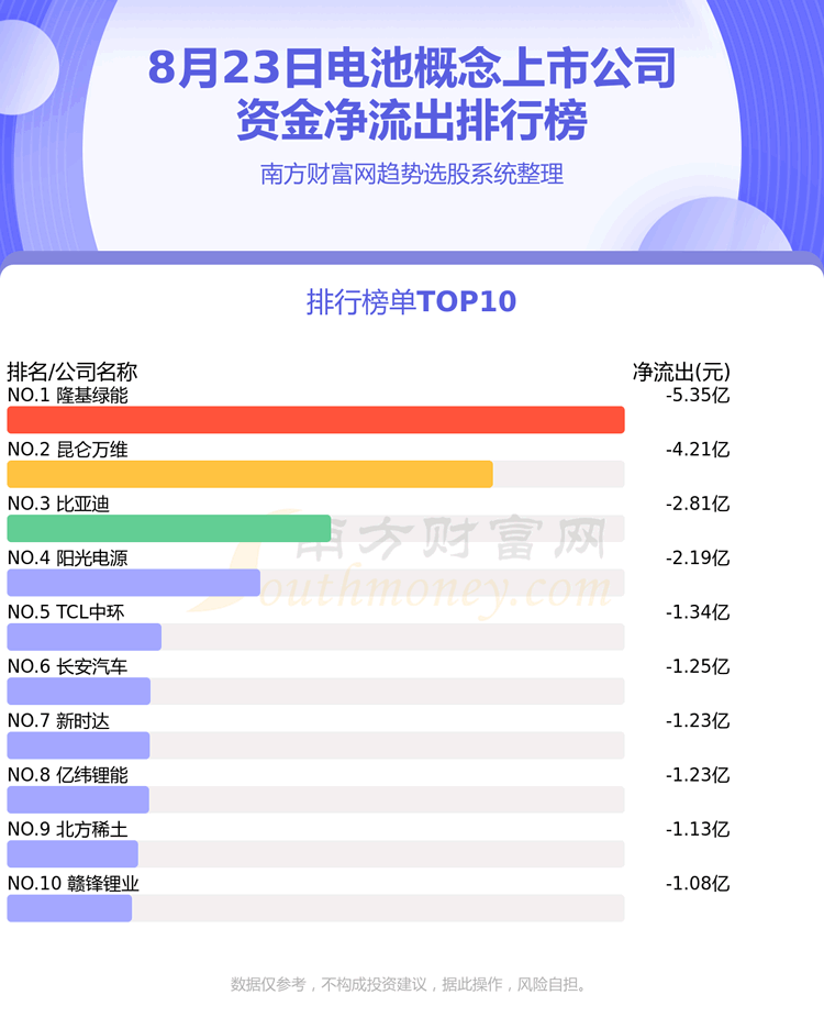 电池概念上市公司8月23日资金净流出情况来看,隆基绿能位列第一位,主力净流出达到-5.35亿元;昆仑万维排名第二,主力净流出为-4.21亿元;比亚迪排名第三,主力净流出-2.81亿元。主力净流出排名前10的还有:阳光电源、TCL中环、长安汽车、新时达、亿纬锂能、北方稀土、赣锋锂业。