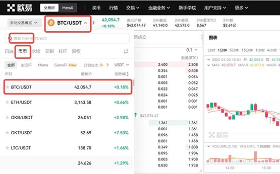 2.在首页左上方点击交易,进入交易页面。点击页面左上方交易对,在下拉框中搜索想要购买的币种,并在币币交易类型中找到并选择相应币对,此处以BTC/USDT交易对为例。
