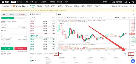 也可以在交易页面点击【资产】,然后点击划转进行资产划转。