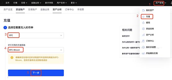 1.登录账号后在欧易交易所官网(点击注册)首页右上方点击【资产管理】—【充值】—选择要充值的币种(以BTC为例)—选择充值网络—点击【下一步】。