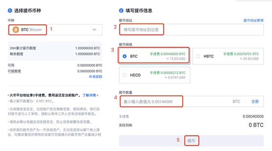 3.打开对方平台的提币页面,选择币种BTC,在提币地址栏下粘贴上述步骤2复制的欧易账户下BTC的充值地址(或者扫描保存的充值二维码)。选择提币网络,要特别注意,如果在上述步骤2中在欧易账户下BTC的充值网络选的是BTC-Bitcoin,那么在对方平台BTC的提币网络也要选择BTC-Bitcoin,请务必保持网络一致,然后输入提币数量,点击【提币】。