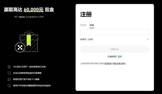 1、未注册过欧易OKX交易所的投资者需先打开欧易交易所官网(点击注册),在首页点击注册进入注册页面。