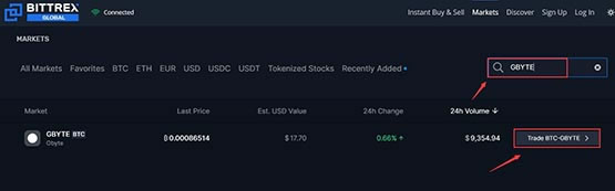 第二步:进入Markets页面后,向下滑动,在右侧搜索框搜索币种简称GBYTE,点击币种右侧的BTC-GBYTE