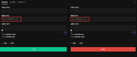 第六步:填写购买数量,点击买入,若是卖出,填写卖出量,点击卖出即可。(注意:KDA最小交易数量为0.1KDA)